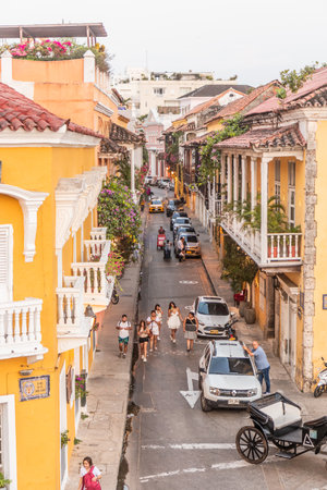 Cartagena , Colombia - 27 December, 2019: Typical street scene at Cartagena, Colombia