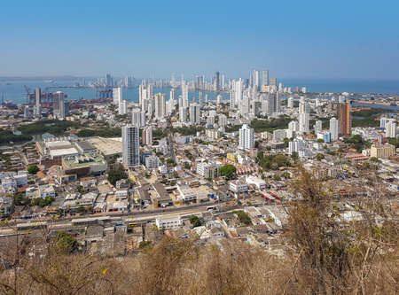 Colombia, scenic view of Cartagena cityscape, modern skyline, hotels and ocean bays Bocagrande and Bocachica from the lookout hill of Santa Cruz convent (Convento de la Popa)