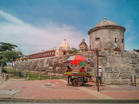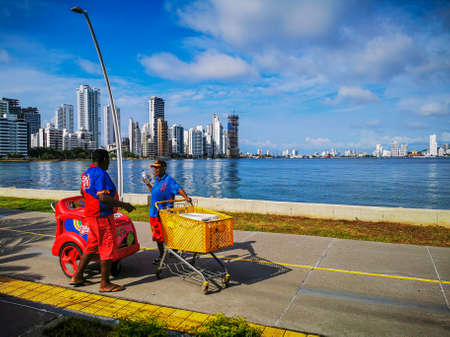 CARTAGENA, COLOMBIA - NOVEMBER 12, 2019: Street vendors by the beach outside the colorful historic city centre.