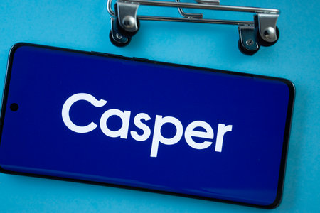 Dhaka, Bangladesh- 03 July 2025: Smartphone screen showing the Casper logo with shopping cart wheels on a blue background.