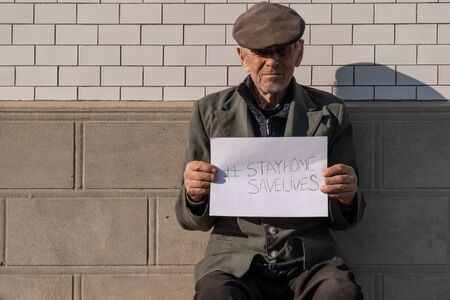 Coronavirus pandemic, senior man in self quarantine to avoid spread of infection by virus covid-19. Stays home looking looking at the camera.