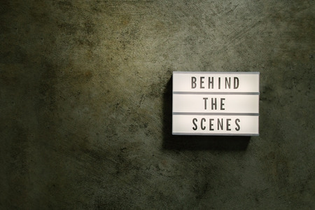 Behind the scenes letterboard text on Lightbox or Cinema Light box. Movie clapperboard megaphone and director chair beside. Background LED color change loop. static camera in video production studio.
