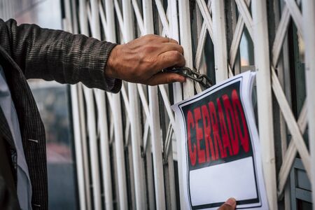 Close up of owner man with closed sign out of his store shop - end of business economy concept - spanish words cerrado panel and crisis period