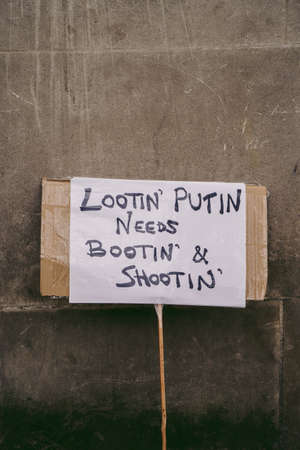 man hands holding piece of white cardboard with words putin ear criminal. protesting against the Russian invasion. banner inscription cardboard massage Hands Off Ukraine.