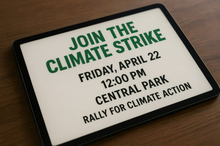 Sign promoting a climate strike event at Central Park, scheduled for April 22 at 12.00 PM, rally encouraging participation for climate action