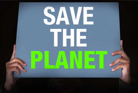 Save the planet Protest Signboard Raising in the Sky. Modern signboard holding protest