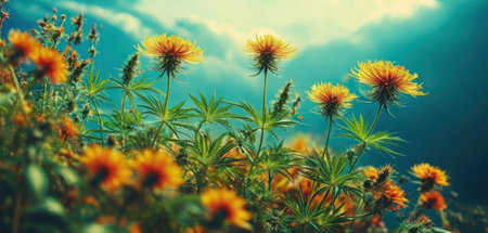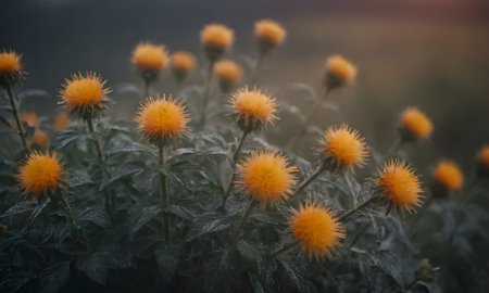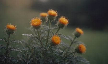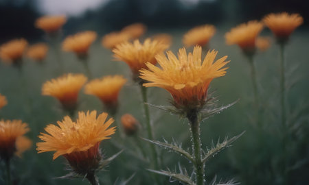 Beautiful orange and yellow thistle flowers blooming in the garden