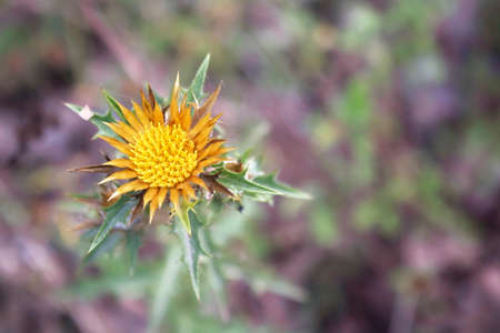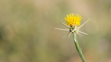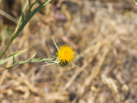 Yellow Star-Thistle or Centaurea solstitialis flower macro, selective focus, shallow DOF.