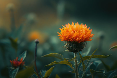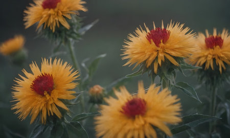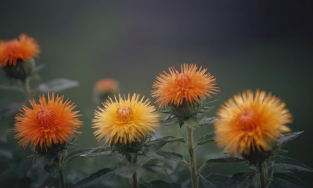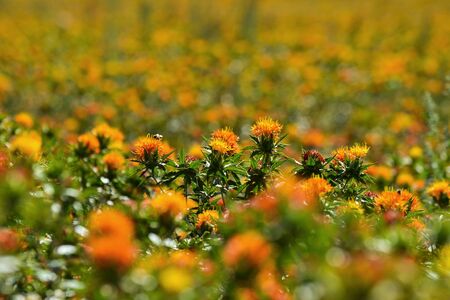beautiful yellow safflowe blooming in nature background, Carthamus tinctorius