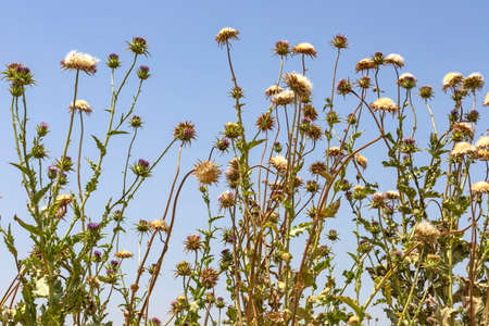 dry borriqueo thistle Onopordum acanthium isolated with green background in horizontal