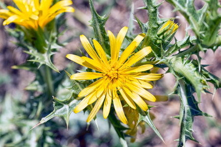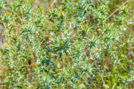 Macro photography of blooming common golden thistle, or Scolymus hispanicus flowers