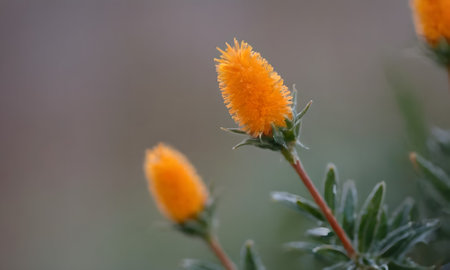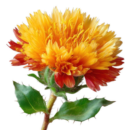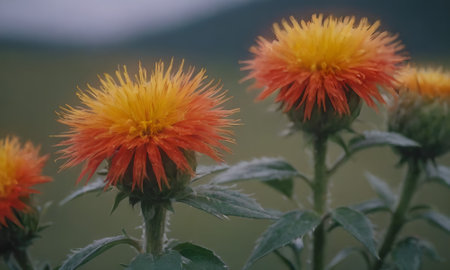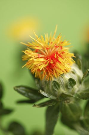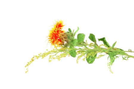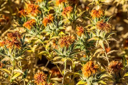 Safflower, Carthamus tinctorius, Asteraceae, Annual thistle-like herb with golden-yellow globose flowe-heads, source of red and yellow dye and for cosmetic and edible oil