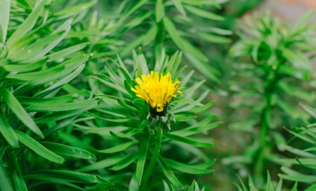 Yellow flower with dew drops on the ground. Shallow depth of field