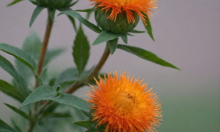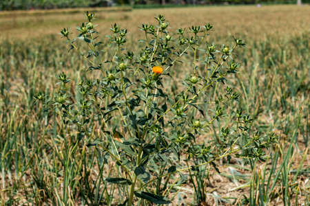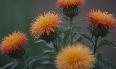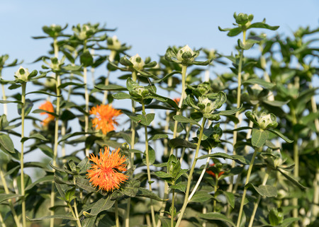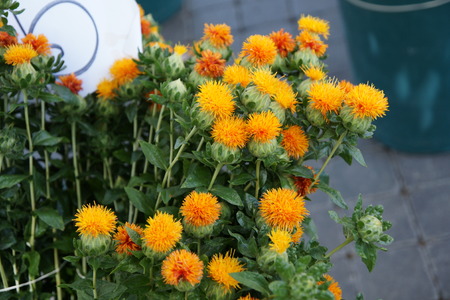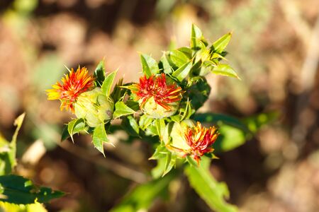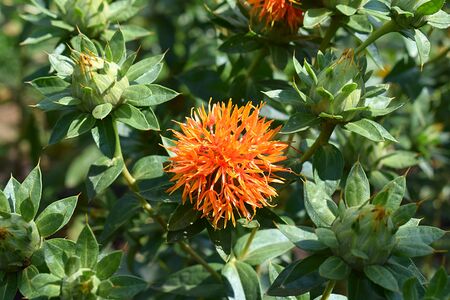 Safflower (Carthamus tinctorius,False saffron) has begun to bloom and buds of Safflowers in garden