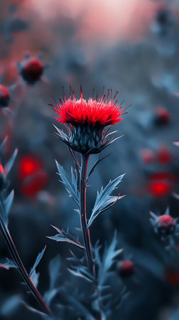 Close-up image features a vivid red thistle with a dark center surrounded by spiky bluish leaves, creating a striking contrast against the soft, blurred background.