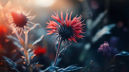 The image captures a close-up of a striking red flower with thin petals, contrasted against a soft, dark background. The artistic lighting creates a dreamlike scene.