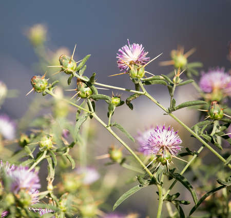 Thistle flowers in the meadow in the morning. Shallow depth of field.