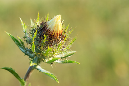 Bud Carline thistle (Carlina vulgaris) on a blurred background. Close-up.