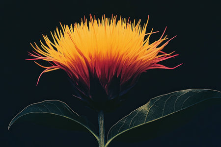 Vibrant close up of a yellow and orange flower against a dark background, showcasing its unique texture and color variations, perfect for floral designs and nature themed projects