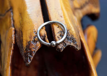 Close up to a silver rounder piercing jewlery over a yellow cow skull. Body Piercing and tattoo concept
