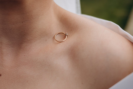 A pair of wedding rings of the bride and groom on the shoulder of the future wife in a white dress. Wedding accessories, ceremony, jewelry, Bridal bouquet of pink roses.