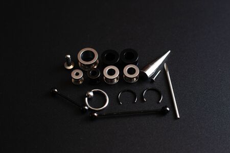 piercing accessories on a black background close-up stainless metal jewelry for puncture lovers
