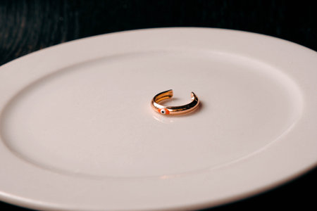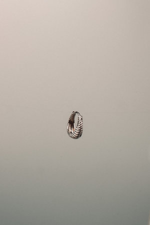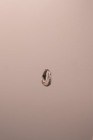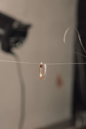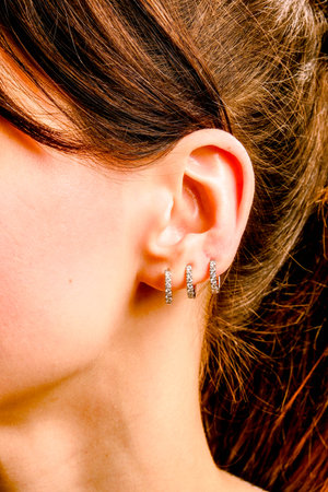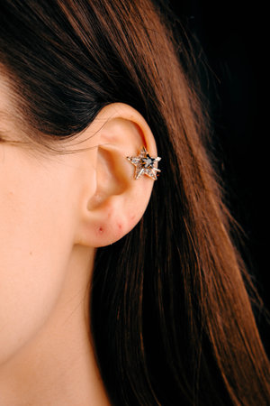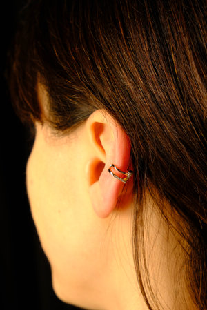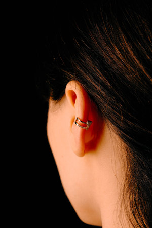 Close-up of a ring-shaped earring on a girl's ear. Macro.