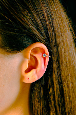Professional holding the jewel of piercing day just before screw the ball. Tragus type.