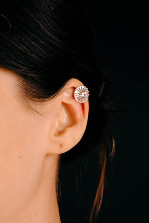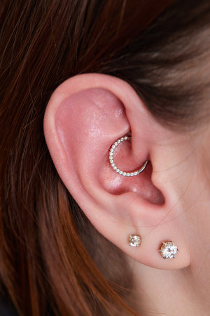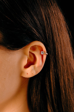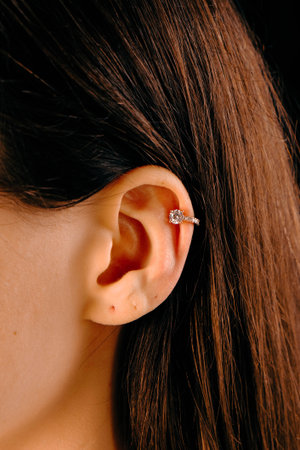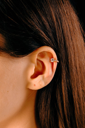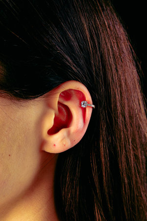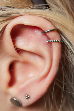 piercings on an ear. Conch and helix piercings close up. Professional holding the jewel.