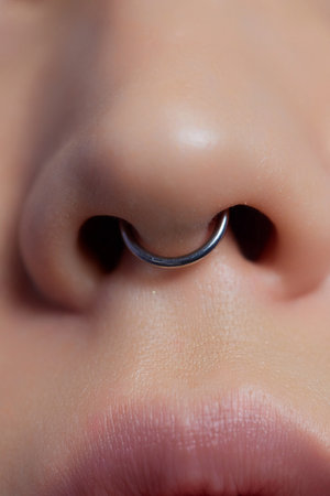 Closeup of a young womans visage with piercing septum hanging from her nose.