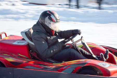 Riding on karting on the auto track. A young guy at the wheel of a carting.