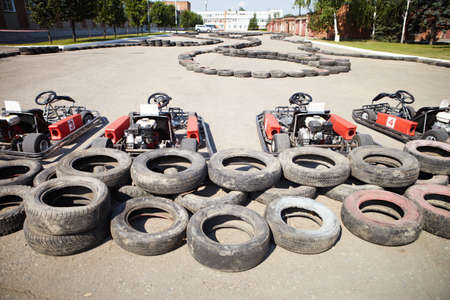 Many racing cars are ready to race on the outdoor track. Machine kart before the start