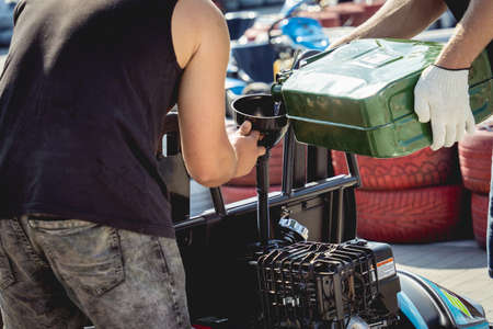 The mechanic hand go kart racing engine's service check the availability in the competition.