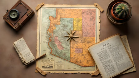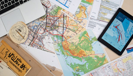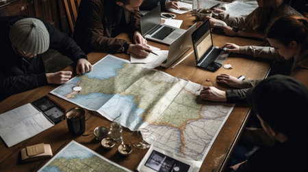 A top-down view captures the exciting moment of planning a new adventure. A detailed paper map is spread out, surrounded by modern technology like a laptop and tablet, alongside a traditional compass.