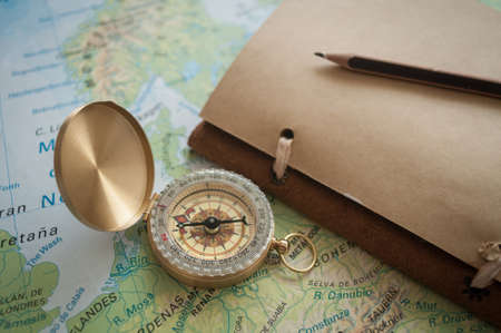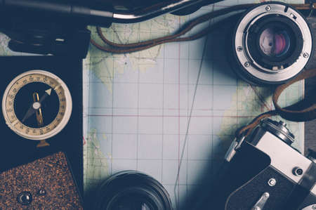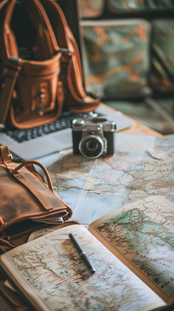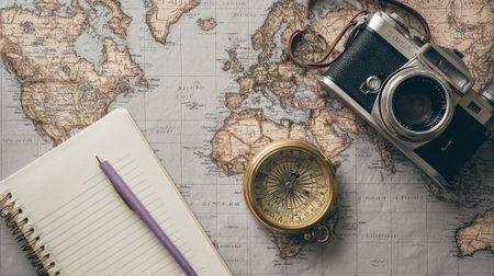 A flat lay composition featuring a vintage camera, a notebook with a pen, a compass, and a map, evoking a sense of adventure and exploration.