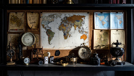 Vintage maps pinned on corkboard, travel souvenirs and compasses on shelf below.