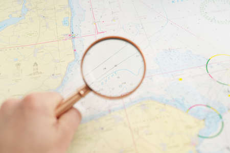Brass magnifying glass and white nautical chart close-up. Vintage still life. Sailing, travel accessories. Planning, concept art, graphic resources, copy space