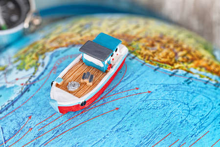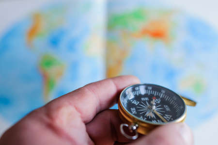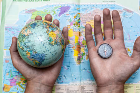 a globe and a compass in the hands of a person on the background of a geographical map of the world the concept of travel tourism