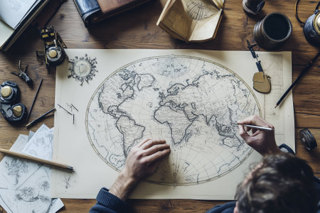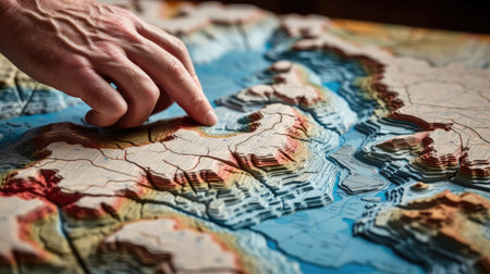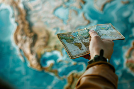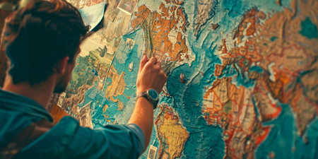 Aerial view of a vintage world map with a hand pointing at a destination. It captures the spirit of exploration and adventure, perfect for travel-themed projects.