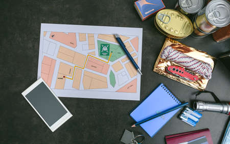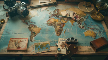 Exploration awaits a world map surrounded by travel essentials and adventure mementos