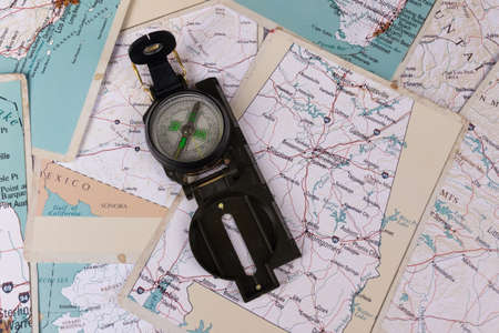 compass and an old copper coin on the geographical map buttons indicate places the concept of treasure hunting treasure hunting. High quality photo