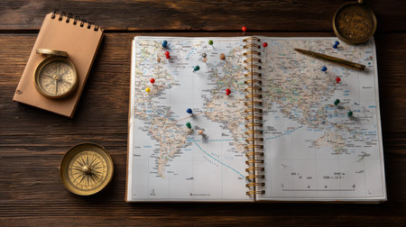 Open notebook displays a vintage map with colorful pins marking locations. A compass and pen accompany it on a rustic wooden table, symbolizing travel inspiration.