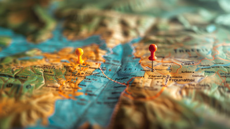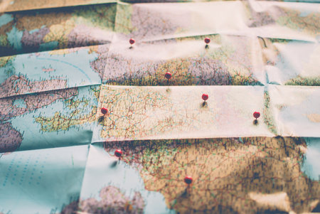 Closeup of a traveler's road map in vintage retro colors. Countries and cities of Western Europe on the map. Red push pins marking various cities