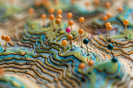 Cartographic Exploration: Map Pins on Contoured Terrain.