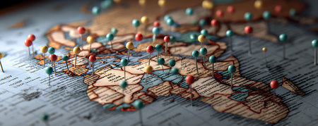 A detailed map with vibrant pinpoint markers showing specific locations in colorful and detailed accuracy