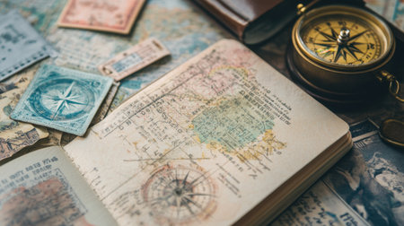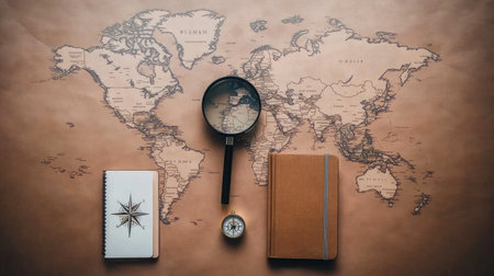 A vintage world map background featuring exploration tools including a compass and magnifying glass, alongside travel notebooks. Perfect for travel and adventure themes.