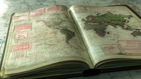 Dynamic image of a traveler exploring a world map filled with different objects, awakening wanderlust. Generative AI