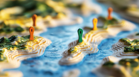 This image features a topographical model of islands set in water, adorned with colorful pins marking various locations. Ideal for geography and travel-related themes.