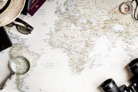 A top view of a world map with a passport, binoculars, sunglasses on it - traveling conce