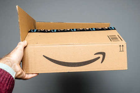 Paris, France - Feb 23, 2019: Man holding against gray background opened Amazon Prime cardboard box with smile Amazon arrow icon